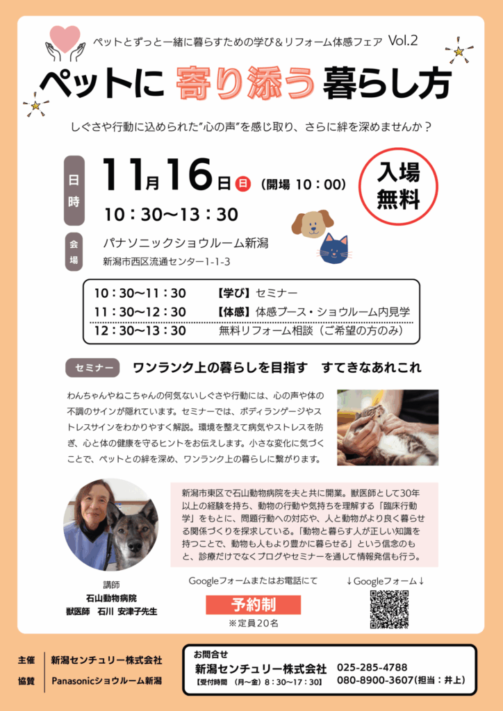 「ペットとずっと一緒に暮らすための学び&リフォーム体感フェア Vol.2」の開催が近づいてまいりました!
